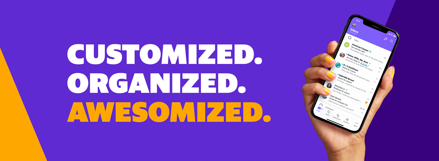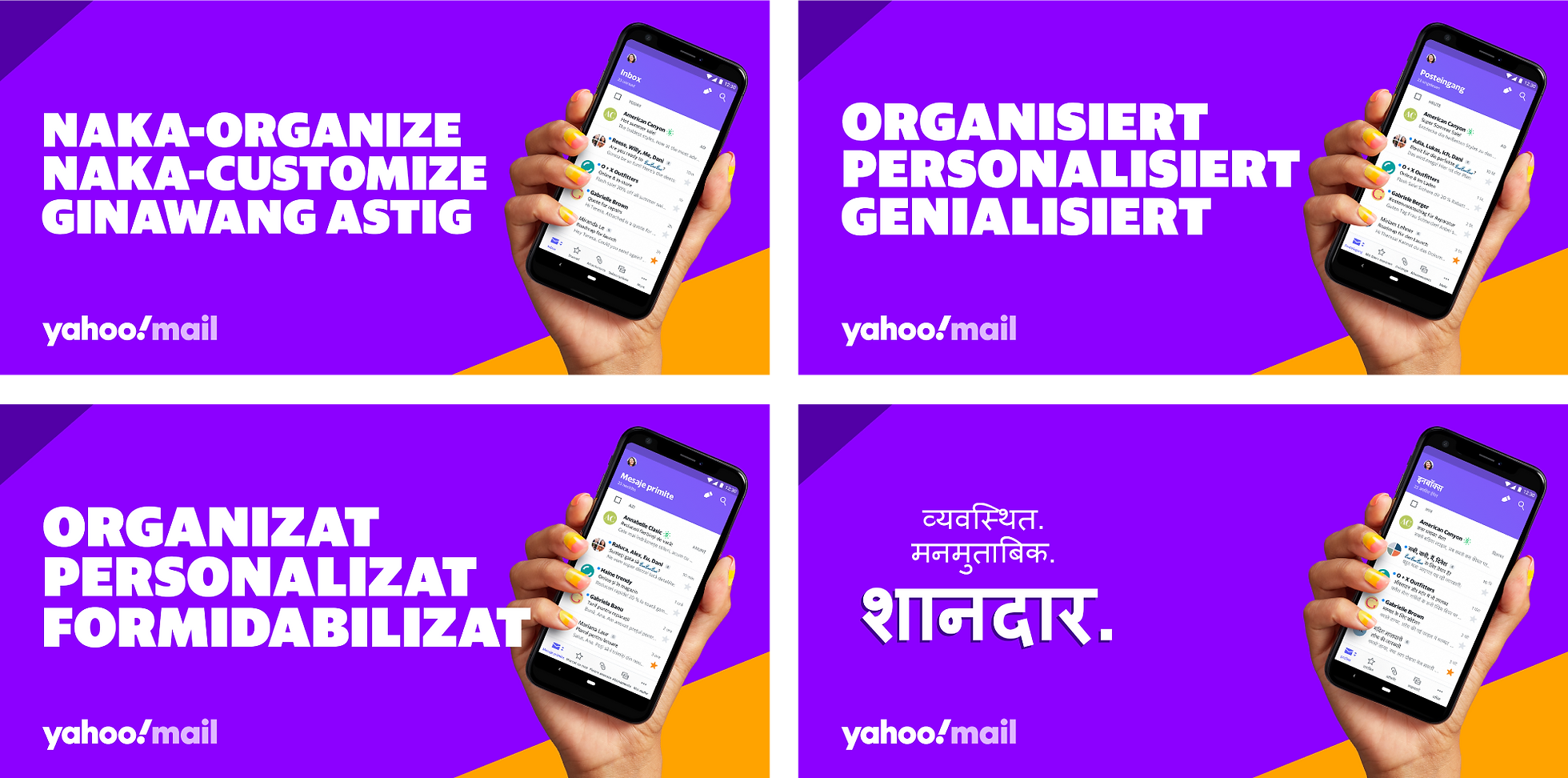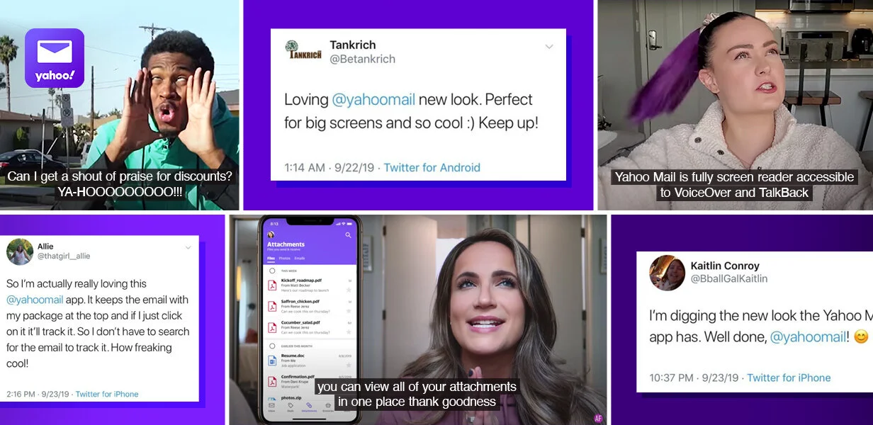 Messaging: Yahoo’s brand and copy tone allowed us the flexibility to talk about Mail’s features in a unique and unexpected way. Yahoo’s global audience meant that messaging needed to speak to universal emotions and be easily translatable across 18 languages.